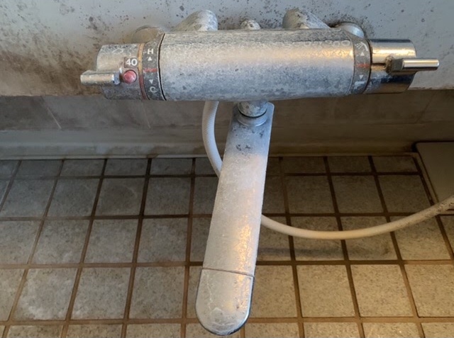 特に金属部分は、水分が乾くたびに白くウロコ状の汚れが固まり、